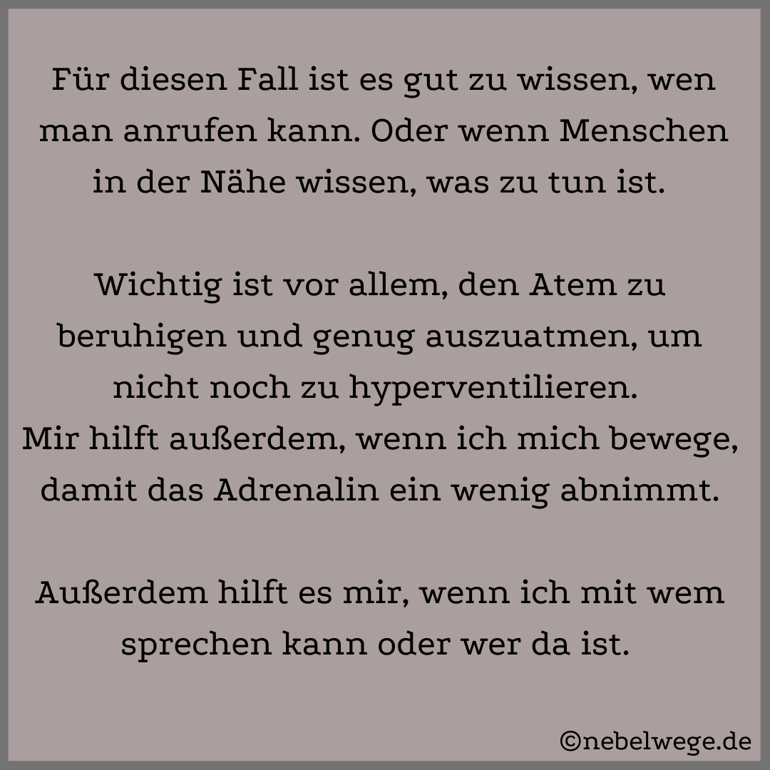 Hilfreich ist außerdem zu versuchen, den Atem zu beruhigen und insbesondere nicht zu viel und tief einzuatmen, um nicht zu hyperventilieren, da das für noch mehr Panik sorgt. Also: Erst atmen und dann entweder sich selbst folgende Sätze sagen, oder jemanden haben, der einen begleitet und einem versichert, dass man sicher ist, dass es vorbei geht, dass man es schon mal geschafft hat, dass es ok ist, verzweifelt zu sein etc.