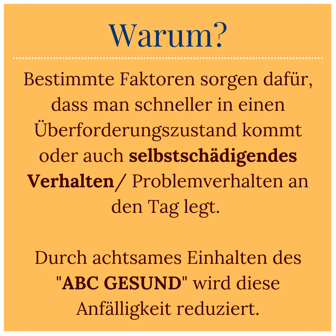 Passend dazu: Das ABC GESUND. Es gibt viele Faktoren, die die Anfälligkeit und emotionale Verwundbarkeit erhöhen oder auch reduzieren. Gerade, wenn es um selbstschädigendes Verhalten/ Problemverhalten geht, ist es wichtig, im Voraus schon so viel wie möglich dem präventiv zu begegnen. Dazu dient das ABC Gesund: