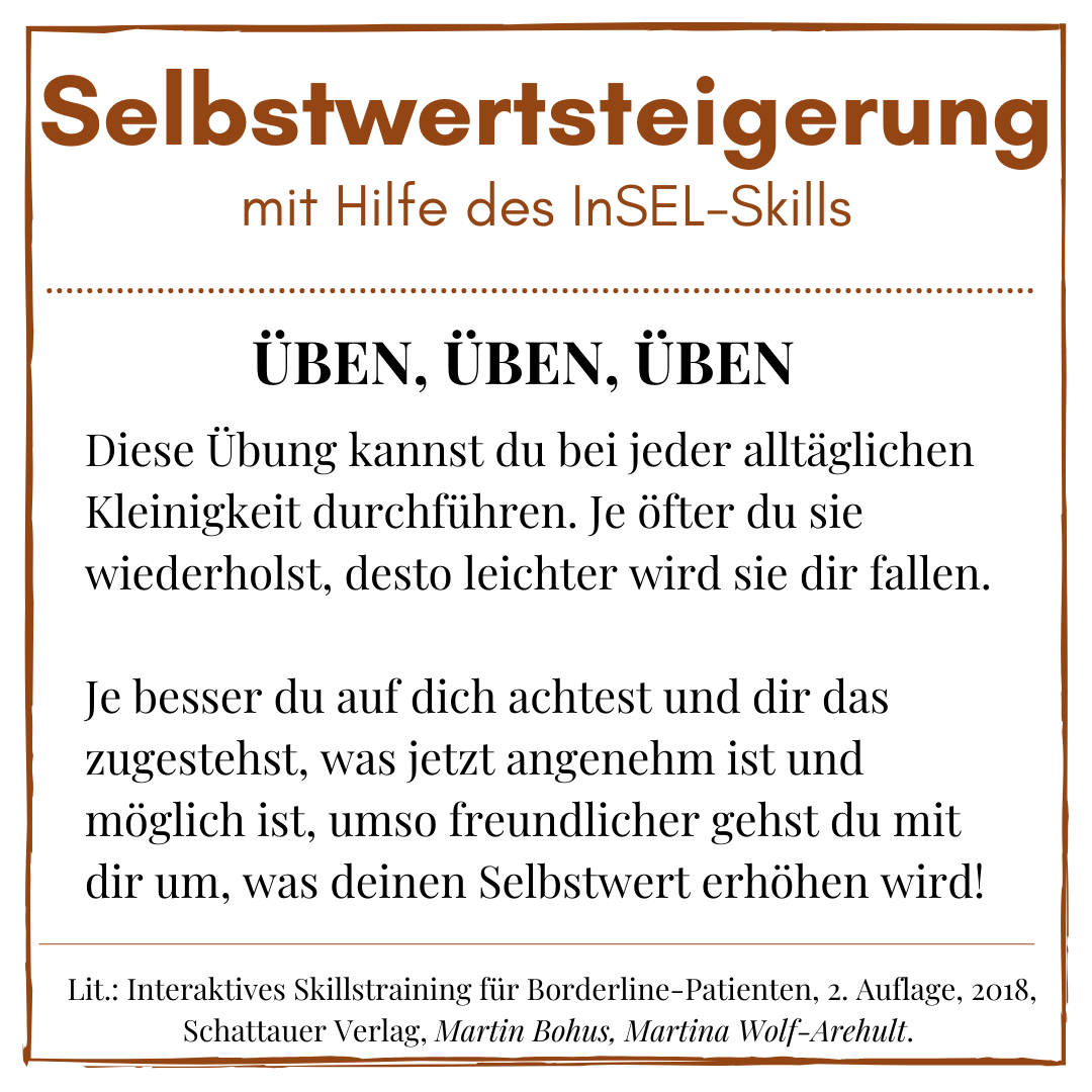 Daneben gibt es Skills, die ich nicht in die Tasche packen kann, aber rglm. benutze: Bewusstes atmen/ Konzentration auf den Atem und zählen: Von 1000 in 7er Schritten rückwärts bis 0. Dadurch ist meine Konzentration gebunden und kann sich nicht mehr mit den schädlichen Gedanken beschäftigen. Natürlich kehren meine Gedanken immer und immer wieder zurück zu den negativen Gedanken und es erfordert viel Kraft und Anstrengung, bei den Übungen zu bleiben.