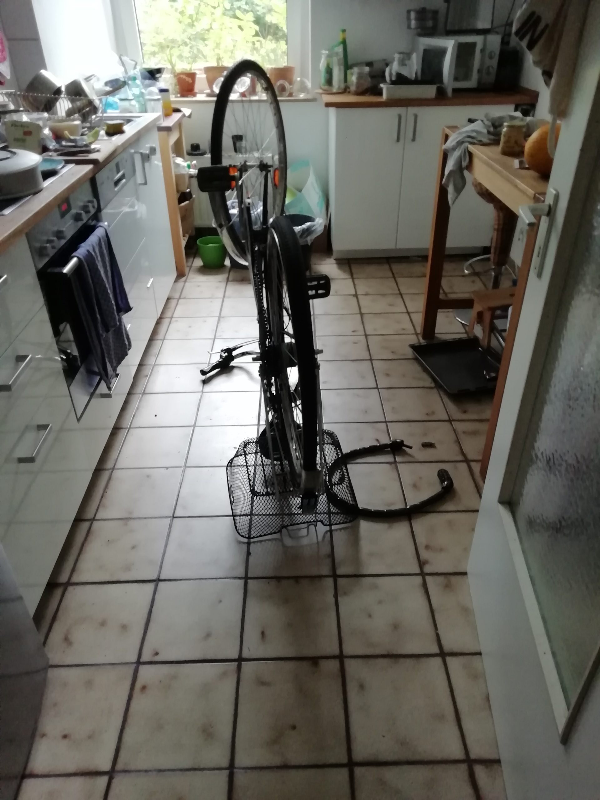 Fahrrad in die Küche bringen und Reifen reparieren